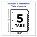 Insertable Style Edge Tab Plastic Dividers, 5-Tab, 11 x 8.5, Translucent, 1 Set. Durable translucent plastic offers style and convenience that lasts. Style Edge Insertable Plastic Dividers feature a distinctive tab design that makes for easy reference and also makes a statement. Customize the included specially designed inserts on your computer with free templates from Avery Design & Print. The unique tab design keeps your inserts from falling out. With these dividers, you're certain to achieve an organizational edge that's both colorful and attractive. For laser and inkjet printers. Index Divider Style: Customizable; Index Divider Size: 11 x 8.5; Punched/Unpunched: 3-Hole Punched; For Use With: Ring Binders.