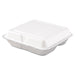 Foam Hinged Lid Containers, 3-Compartment, 7.5 x 8 x 2.3, White, 200/Carton. Insulated to accommodate both hot and cold foods. Non-absorbent. Stackable. Food Container Type: Hinged Take-Out Container; Material(s): Foam; Color(s): White; Width: 7.5".