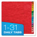Expanding Desk File, 31 Dividers, Date Index, Letter Size, Red Cover. Expandable indexed desk file features preprinted laminated tabs and reinforced, rip-proof tape gusset top and bottom for added strength. Cover resists moisture. Inner dividers with center hole to see papers. Indexed Sorters Type: Expandable Indexed Desk File; Index Tab Style: 1-31; Number of Leaves/Dividers: 31; Document Size: Letter.