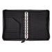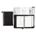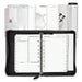 Woven Vinyl Starter Set, 8 1/2 x 5 1/2, Black Cover. Faux cover looks and feels like woven leather. Provides three months of undated planning pages (one-page-per day, two-pages-per-day and two-pages-per-week), 12 undated tabbed monthly dividers, tabbed telephone/address pages, assorted reference pages, credit/business card holder, lined note pad, zip pouch and page locator. Internal pockets and pen loop offer additional storage. Zipper closure keeps contents safely contained. Size: 8.5 x 5.5; Page Color/Theme: Green/White; Appointment Ruling: Open Scheduling; Page Format: One Day per Two-Page Spread; One Day per Page; One Month per Two-Day Spread; One Week per Two-Day Spread.