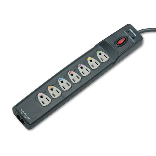 Seven-outlet surge protector with rugged steel housing. 1,250 joules plus catastrophic fuse, illuminated on/off switch and 15-amp circuit breaker. ...
