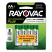 Recharge Plus NiMH Batteries, AA, 4/Pack. Less waste, and even more power. Rayovac® Rechargeable Plus batteries last up to four times as long as alkaline batteries, and twice as long as standard Rayovac® rechargeables. Use these powerful batteries time and time again. Battery Type: NiMH Rechargeable; Battery Size: AA; Battery Capacity: 2400 mAh; Voltage: 1.2 V.