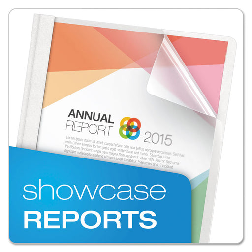 Clear view draws the reader in. First page can include report name and customized graphics. Standard-grade leatherette embossed back cover. Front C...