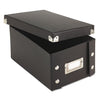 Collapsible Index Card File Box, Holds 1,100 5 x 8 Cards, Black. Durable index card file is easy to assemble—just snap together and begin filing. Sturdy black fiberboard with a water-resistant laminate. Steel corners. Chrome label holder on front. Card Holder Type: Card File Box With Lift-Off Lid; Card Capacity: 1,100; For Card Size: 5" x 8"; Color(s): Black.