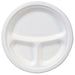 EcoSmart Molded Fiber Dinnerware, 3-Compartment Plate, White,10"Dia, 500/Carton. Choose durable dinnerware, made from economical molded fiber as a sturdy alternative to foam. Conveniently microwavable dinnerware. Built with a durable design to resist soak-through and withstand the toughest meals. Three-Compartment Plate. Dinnerware Type: Compartment Plate; Material(s): Molded Cellulose Fiber; Shape: Round; Diameter: 10".