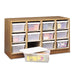 Modular Wood/Plastic 12 Bin Supplies Organizer, 34 x 13 x 19, Medium Oak/Clear. Transparent plastic storage boxes with lids allow easy viewing of contents. Ideal for office, school or craft supplies. Convenient adhesive labels are included for quick identification of box contents. Sturdy compressed wood cabinet with hardboard shelves hold 12 bins securely. Easy to assemble. Boxes & Bins Type: Covered Modular; Material(s): Wood; Color(s): Medium Oak/Clear; Number of Compartments: 12.