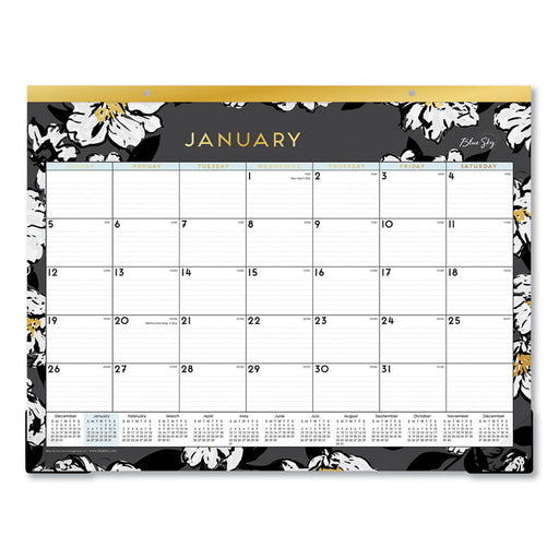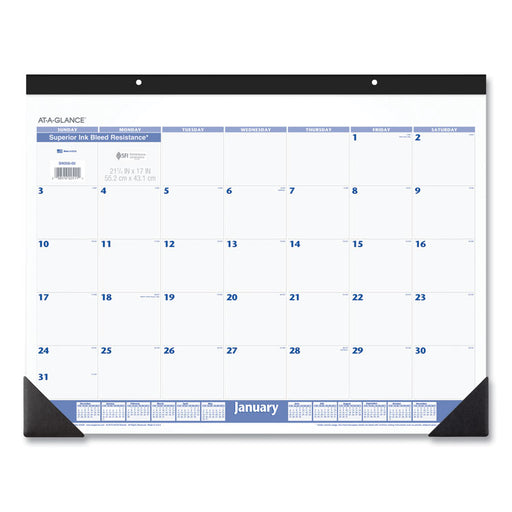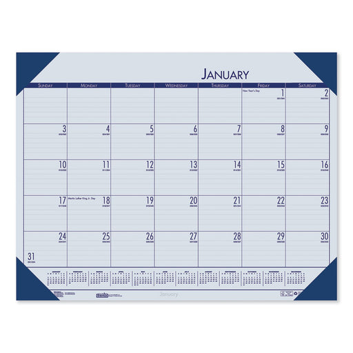 Desk pad is printed in blue and gray ink for a classic but stylish look. One month per page with unruled daily blocks and full-year calendar refere...