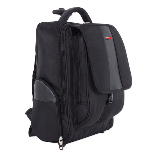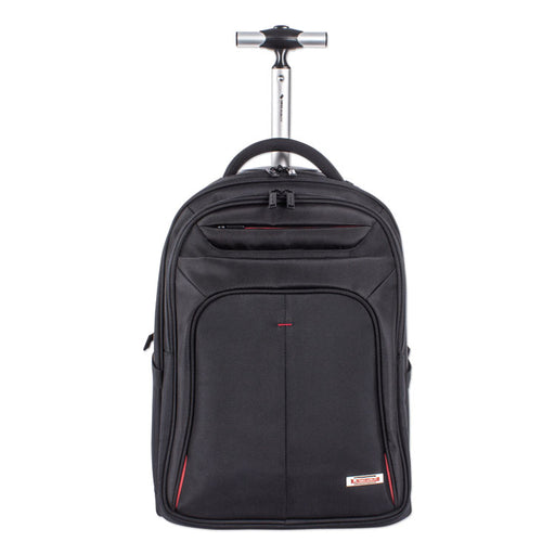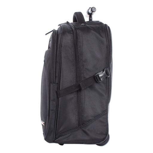 Includes a padded laptop compartment and front organizer pocket for business essentials. Smooth-rolling, in-line skate wheels and adjustable uprigh...