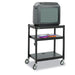 Adjustable-Height Steel AV Cart, 27.25w x 18.25d x 28.5 to 36.5h, Black. Powder coated steel cart (for durability) holds up to a 20" monitor. Three 24 x 18" shelves, plus six-outlet UL approved mini-surge protector with power switch. Adjustable in 2" increments from 28 1/2" to 36 1/2" high. Ideal for media equipment. Mobile on four 4" casters (two locking). Color: Black; Color Family: Black; Capacity (Weight): 120 lbs; Caster/Glide/Wheel: Four 4" Casters (2 Locking).