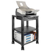 Mobile Printer Stand, Two-Shelf, 17w x 13.25d x 14.13h, Black. Space-saving unit stores printer, paper and accessories. Reinforced shelves accommodate most laser or inkjet printers. Handy cable management feature keeps cords under control. Locking casters. Easy assembly with no tools required. Height adjusts in 1 1/4" increments for personal comfort level. Two-Shelf Stand—Height adjusts from 11 7/8" to 14 1/8" in 1 1/4" increments; stows under desk to conserve floor space. Color: Black; Color Family: Black; Capacity (Weight): 75 lbs; Caster/Glide/Wheel: Four Casters (2 Locking).