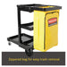Multi-Shelf Cleaning Cart, Three-Shelf, 20w x 45d x 38.25h, Black. The Rubbermaid Commercial Utility Cart with Zippered Yellow Bag collects waste and transports tools efficiently on 8" non-marking wheels and 4" casters. This versatile utility cart has 3 lipped shelves, and a zippered yellow vinyl bag for collecting refuse or launderable items. The surface of the top shelf features tool grips for keeping frequently used items at hand wherever this service cart travels. Color: Black; Color Family: Black; Caster/Glide/Wheel: Four Casters; Overall Width: 20".