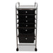 Portable Drawer Organizer, 13w x 15.38d x 32.13h, Smoke/Matte Gray. Convenient way to arrange and store your workload. Durable metal frame and chrome plated drawer pulls. Casters provide mobility. Easy assembly helps save valuable time. Six-Drawer Organizer—32 1/8" high. Four small drawers, each 10-1/4"w x 14-1/4"d x 2-3/4h; two large drawers, each 10-1/4"w x 14-1/4"d x 5-1/4"h. Color: Smoke/Matte Gray; Color Family: Gray; Caster/Glide/Wheel: Four Swivel Casters (2 Locking); Material(s): Metal Frame; Plastic Drawers.