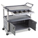 - A rolling utility cart with two shelves, a lockable cabinet and a sliding drawer.