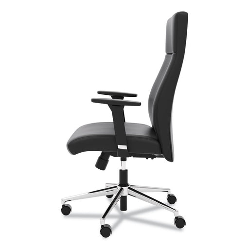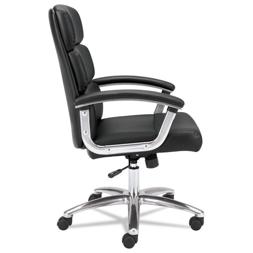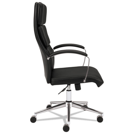 Black leather upholstery offers luxurious comfort and style. Comfortable padded leather-wrapped armrests. Contemporary polished aluminum five-star ...