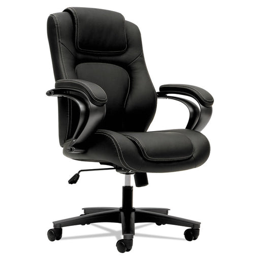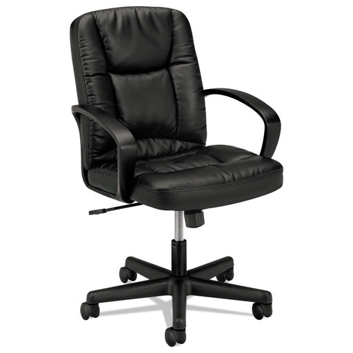Black leather upholstery for luxurious comfort and style. Supportive padded loop arms. Five-star base with casters for easy mobility. Recommended A...