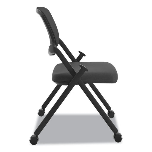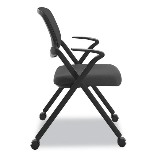 Contemporary design with a contoured upholstered back and flip-up seat. Folds to 8" for space-efficient nested storage. Padded arm supports for add...