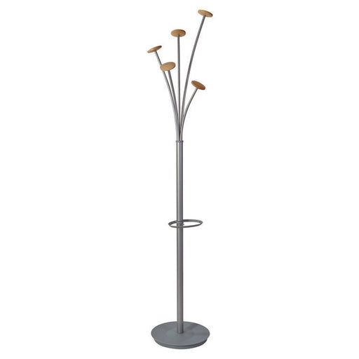 Features a contemporary look. Stylish and functional. Includes five coat knobs, an umbrella stand and a water retainer. Weighted base for perfect s...