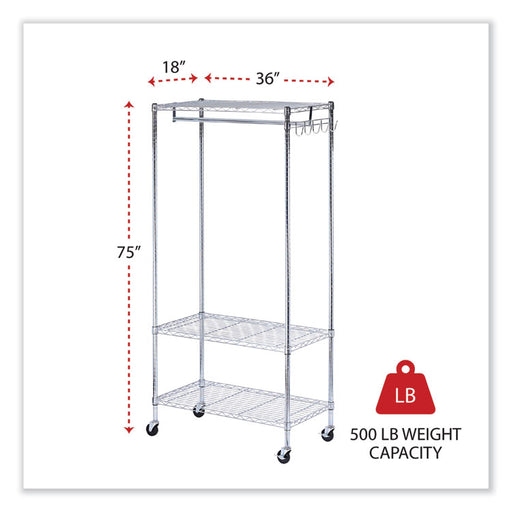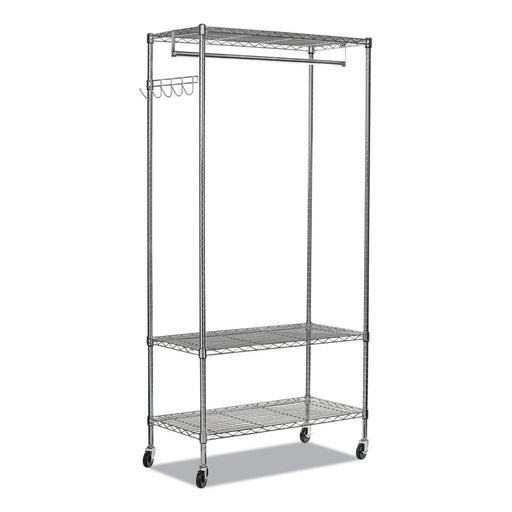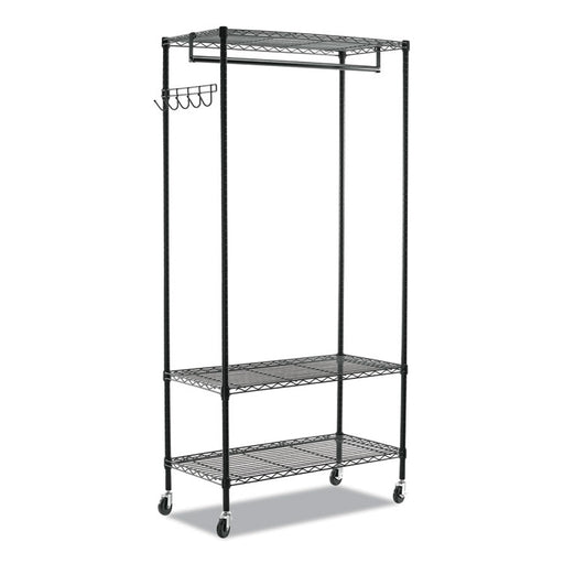 Single-sided freestanding garment rack with top and bottom shelf keeps coats, garments, shoes and umbrellas neatly organized in meeting rooms or co...