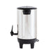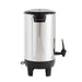 30-Cup Percolating Urn, Stainless Steel. Features locking safety lid, carry handles and dripless safety spigot. With high dome design, volume sight glass and lighted power switch. Standard two prong plug. Includes water dispenser. Built-in coffee filter. No need for disposable filters. Number of Cups: 30; Material(s): Stainless Steel; Color(s): Stainless Steel; Height: 15".