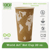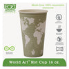 World Art Renewable/Compostable Hot Cups, 16 oz, Moss, 50/Pack. Hold the world in the palm of your hand, with cups that are designed with an attractive World Art™ pattern. Lined with Ingeo™, a leak-proof plant-based plastic, to prevent leaks. Sturdy cups are an excellent choice for hot beverages like coffee and tea. Cup Type: Hot; Capacity (Volume): 16 oz; Color(s): Moss; Color Family: Green.