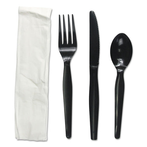 Four-Piece Cutlery Kit, Fork/Knife/Napkin/Teaspoon, Heavyweight, Black, 250/Carton