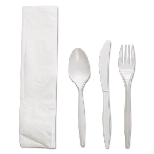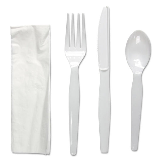 Four-Piece Cutlery Kit, Fork/Knife/Napkin/Teaspoon, White, Polypropylene, 250/Carton