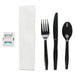 Six-Piece Cutlery Kit, Condiment/Fork/Knife/Napkin/Teaspoon, Black, 250/Carton. Why stock six items when you can have all of them in one convenient package? This kit contains a fork, spoon, knife, napkin, and salt and pepper packets, allowing you to cover all of your bases with a single, high-quality item.