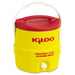 Industrial Water Cooler, 3 gal, Yellow Red. HDPE hide won't chip, peel, buckle, or rust. Ultratherm® insulation for maximum cold retention. UV stabilizers prevent fading, cracking in all exposures. White FDA Grade liner is easy to clean and resists stains and odors. Wide mouth pressure fit lid for easy filling. Keeper cord prevents lid loss. Capacity (Volume): 3 gal; Material(s): Plastic; Color(s): Yellow/Red; Diameter: 13.75".