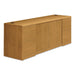 10700 Series Credenza w/Doors, 72w x 24d x 29.5h, Harvest. A modular management solution that combines stylish profiles and elegant accents with top-grade fit and finish. High-pressure laminate with rounded corners and waterfall edge. Locking file drawers operate on steel ball bearing suspensions. Hang rails accommodate letter and legal size hanging files. Two doors conceal center storage area with fixed shelf. Two cord management grommets. HON® "One Key" core removable locks. Color: Harvest; Color Family: Oak; Pedestal Count: 2; Drawer Configuration: Left: File/File; Right: File/File.