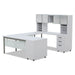 e5 Series Executive U-Workstation, 72w x 96d x 62h, White/RavenHard-working workstation includes 72 x 30 desk with acrylic modesty panel, 42" bridge with acrylic modesty panel, 72 x 24 credenza, two box/box/file pedestals, 72" overhead cabinet with frosted glass doors, vertical organizer and horizontal organizer.