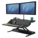 Lotus Sit-Stands Workstation, 32.75" x 24.25" x 5.5" to 22.5", Black. The Lotus™ Sit-Stand Workstation makes it effortless to add movement to your workday for improved wellness. Patent-pending Smooth Lift Technology™ keeps your workstation stable and makes changing positions effortless. Features 22 different height settings and 17” of vertical adjustment so you can work in a position that’s perfect for you. Innovative cord management and device charging slot allow your entire workspace to move freely with you. Arrives fully assembled - no complicated instructions, no mounting, just unpack and get started. Compatible with Fellowes® Lotus™ Dual Monitor Arm Kit. BIFMA Tested; Holds up to 35 lbs. Color: Black; Color Family: Black; Width Maximum: 32.75"; Depth Maximum: 24.25".