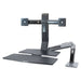 WorkFit-A Sit-Stand Workstation with Worksurface+, Dual 24" LCDs, Polished Aluminum/Black. Ideal for corner workstations, clamps to the rear or side of most surfaces and enables an effortless sit-and-stand work style. Fold the keyboard up and swing the arm out of the way when you need your desk surface. Change from a sitting to a standing position whenever you want. This height-adjustable workstation moves your keyboard and display in one simple motion, making computing comfortable for prolonged periods. Holds two LCD monitors up to 24" each. Color: Polished Aluminum/Black; Color Family: Black; Weight Capacity (text): 25 lbs; Arm Length (Extended): 42".