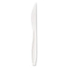 Reliance Medium Heavy Weight Cutlery, Standard Size, Knife, Bulk, White, 1000/CT. Elegant disposable cutlery may easily be used for special gatherings, casual dining or takeout/delivery. Optimized strength-to-weight ratio helps provide superior performance. Pieces feature an ergonomic grip. Oriented Bulk Packaging. Utensils Type: Knife; Material(s): Polystyrene; Color(s): White; Grade: Medium Heavy Weight.