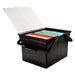 Companion Portable File, Letter/Legal Files, 17" x 14" x 11", Black. Industrial grade plastic portable file holder with see-through, hinged lid. Includes easy-lift handles and built-in tracks for letter or legal size hanging file folders (sold separately). Use file alone or set inside Heavy-Duty File Shuttle II (AVT-FS-2BH