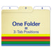 All Tab File Folders, 1/3-Cut Tabs, Letter Size, Assorted, 80/Pack. The folder in your hand is always the one you need, because you choose the tab position. Each folder can have any of three tab positions, depending on where you fold it. Choose the tab you want and fold the others down. Scored spine adds flexibility and convenience to your filing. 11 pt. stock. File Folder Size Type: Letter; File Folder Color: Assorted; Color Family: Multicolor; File Folder Color Assortment: Blue; Green; Orange; Red; Yellow.