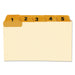 Manila Index Card Guides with Laminated Tabs, 1/5-Cut Top Tab, 1 to 31, 3 x 5, Manila, 31/Set. Great for organizing, desktop referencing and managing follow-up files. Preprinted laminated tabs deliver long-wearing durability. Durable cardstock won't easily bend, tear or crease. 31 Guides—1/5 Cut Tabs. Guide Size: 3 x 5; Tab Type: Top Tab; Tab Cut: 1/5-Cut; Tab Position: Assorted.