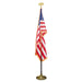 Deluxe 3 ft x 5 ft U.S. Flag, 8 ft Oak Staff, 2" Gold Fringe, 7" Goldtone Eagle. Indoor U.S. flag and staff set includes an 8-ft. oak jointed-wood staff with a round base. A 7" gold tone eagle sits on top of the staff. The flag is trimmed with 2" gold fringe and 4" tassels. Design: U.S.A.; Flag Length: 60"; Flag Height: 36"; Flag Material: Heavyweight Nylon.