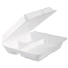 Foam Hinged Lid Containers, 1-Compartment, 6.4 x 9.3 x 2.9, White, 100/Pack, 2 Packs/Carton. Insulated to accommodate both hot and cold foods. Non-absorbent. Stackable. Food Container Type: Hinged Take-Out Container; Material(s): Foam; Color(s): White; Width: 6.4".