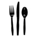 Three-Piece Cutlery Kit, Fork/Knife/Teaspoon, Black, 250/Carton. Serve any meal with this cutlery kit. Each pre-packaged wrapping contains a medium weight plastic fork, spoon and knife.