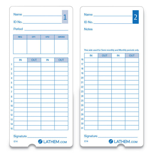 Two-sided time cards for Lathem® Time model 400E time clock. Universal card supports all pay periods. 7" high card requires Lathem® Time 25-7EX Tim...