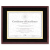 Hardwood Document/Certificate Frame w/Mat, 11 x 14, 8 1/2 x 11, Black. Display awards, certificates, diplomas or other important documents in this handsome solid-wood frame. Charcoal and gold-tone paper mat provide a touch of elegance. Plastic cover protects your displayed document. Frame may be mounted vertically or horizontally. Frame Type: Certificate/Document; Frame Material: Wood; Frame Color: Black; Color Family: Black.