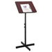 Adjustable Speaker Stand, 21w x 21d x 29.5h to 46h, Mahogany/Black. Speaker podium ideal for presentations requiring no support equipment. Podium height adjusts from 30" to 44". Reading platform tilts from flat position to 70°. Paper stop keeps materials secure at all viewing angles. Designed with wood laminate top and black trim. Features steel base with floor levelers. Color: Mahogany/Black; Color Family: Mahogany; Overall Width: 21"; Overall Depth: 21".