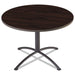 iLand Table, Cafe-Height, Round Top, Contoured Edges, 42" dia x 29"h, Mahogany/Black. Extremely durable for longevity, with contemporary casual comfort and style. Create ideal collaboration zones in cafés, common areas or conference meeting spaces. Urethane edge treatment is visually appealing and permanently bonded that will not allow liquids to seep in. Edgeband treatment is a premium high-pressure laminate top with molded PVC banding. Contour Edge Round Seated Style. Top Color: Mahogany; Color Family: Mahogany; Base Color: Black Base; Top Shape: Round.