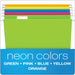 Glow Hanging File Folders, Letter Size, 1/5-Cut Tab, Assorted, 25/Box. Add a colorful flair to filing. Glow design is easy to find and is perfect for color-coding. Tabs and blank inserts included. Folder Size Type: Letter; Folder Color: Assorted; Color Family: Multicolor; Folder Color Assortment: Glow Blue; Glow Green; Glow Orange; Glow Pink; Glow Yellow.