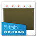 Ready-Tab Reinforced Hanging File Folders, Letter Size, 1/5-Cut Tabs, Standard Green, 25/Box. Built-in tabs are preattached -- just lift and label. Polylaminate is reinforced across the top edge and bottom fold for superior durability. Write directly on the tabs or use the included sticker labels. Folder Size Type: Letter; Folder Color: Standard Green; Color Family: Green; Folder Material: 11-pt Stock.