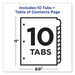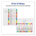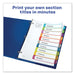 Customizable TOC Ready Index Multicolor Dividers, 1-10, Letter. Organized documentation makes a business run like a well-oiled machine. These Ready Index® Table of Contents Dividers help you stay organized so you can locate documents quickly and efficiently. They feature preprinted multicolor tabs that can be displayed in either landscape or portrait format. Using free templates from Avery Design & Print you can customize the included table of contents page and print in minutes. Organization and efficiency—makes life better for your business. For laser and inkjet printers. Contemporary Colors. Index Divider Style: Arabic Numeric; Index Divider Size: 11 x 8.5; Punched/Unpunched: 3-Hole Punched; For Use With: Ring Binders.
