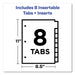 Insertable Big Tab Dividers, 8-Tab, Letter. Big Tab™ dividers are bigger providing 50% more writing space than standard tabs. Special tab design allows easy insertion and removal, but keeps insert securely in place. Reinforced binding edge. White or buff paper dividers with clear or multicolor insertable tabs. It's easy to customize inserts using free templates from Avery Design & Print. Three-hole punched for use in standard ring binders, mini size 5.5 x 8.5 dividers are seven-hole punched for small binders and organizers, and legal size are 4-hole punched for legal size binders. Handwrite or print inserts on laser and inkjet printers. Big Tab™ Buff Paper—Double-sided gold-reinforced edge. Index Divider Style: Customizable; Index Divider Size: 11 x 8.5; Punched/Unpunched: 3-Hole Punched; For Use With: Ring Binders.