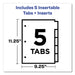 Insertable Big Tab Plastic Three-Pocket Corner Lock Dividers, 5-Tab, 11.13 x 9.25, Assorted, 1 Set. Keep papers safe and secure with these Insertable Plastic Dividers. They offer storage space along with extra large tabs in eye-catching colors for quick, easy reference. Each divider features three pockets constructed in durable plastic to accommodate loose papers up to 8 1/2" x 11" without folding or punching. The unique Corner Lock® tab helps keep your papers in place. Big Tab™ multicolored dividers have tabs that are bigger, providing 50% more writing space than standard tabs. Three-hole punched and ready-to-use. Now that's a big idea. Handwrite or print inserts on laser and inkjet printers. Index Divider Style: Customizable; Index Divider Size: 11.13 x 9.25; Punched/Unpunched: 3-Hole Punched; For Use With: Ring Binders.