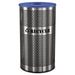 Stainless Steel Recycle Receptacle, 33 gal, Stainless Steel. Attractive, durable receptacle is designed for indoor use (but may be used outdoors if placed under a protective canopy). Brushed stainless steel design is highlighted by a contemporary perforated pattern. Laser-cut "Recycle" and universal recycling symbol ensure "for-use" clarity. Flat lid features a fingerprint-proof blue finish and an 8" diameter opening. Leak-proof LLDPE plastic liner simplifies materials collection. Coated-steel security cable keeps lid and receptacle together, minimizing vandalism and theft. Wrap-around rubber gasket on bottom protects floor surfaces. Waste Receptacle Type: Indoor Recycling Bin; Material(s): Stainless Steel; Application: Indoor Recycling; Capacity (Volume): 33 gal.