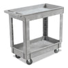 Utility Cart, Two-Shelf, Plastic Resin, 24w x 40d, Gray. Durable resin construction helps create a strong, two-shelf utility cart. Molded-in handle allows for easy steering on the go. Convenient swivel casters allow multi-directional travel. Fixed shelves with a raised lip provide a sturdy storage spot.